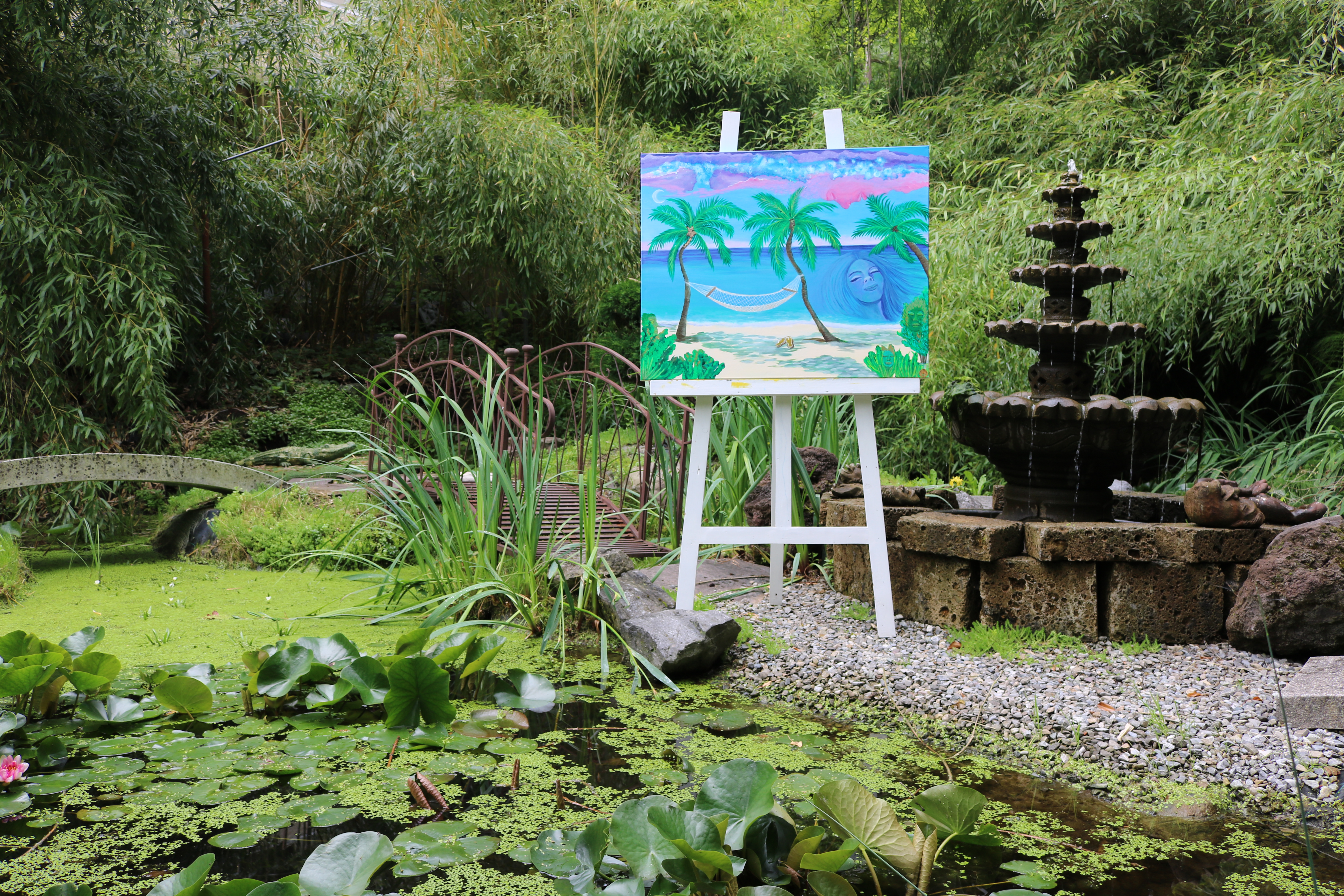 ``My paradise is a beach where I feel at home. The perfect place I can imagine is relaxing in a hammock on a evening on the beach. In the painting you see nine hidden faces in the nature. The ocean, the clowds, the palm trees and the bushes are alive. :) It has the meaning that we should treat the nature with respect and don’t do Evolution! We are in a perfect harmony with nature if we treat it with love!``